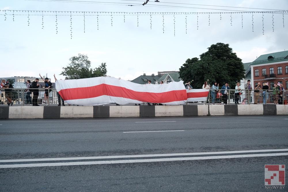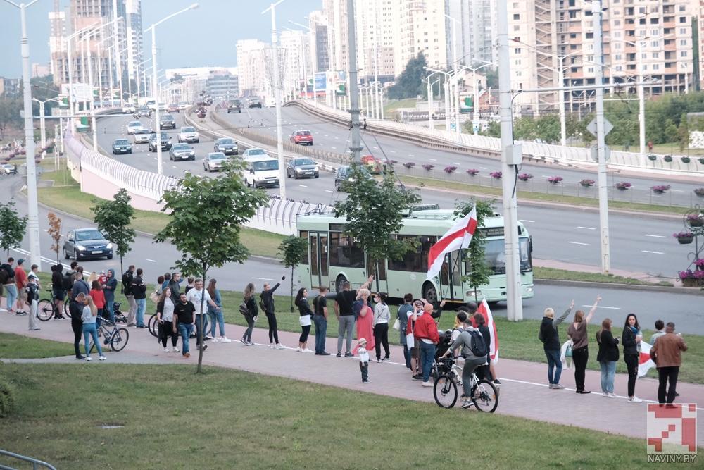Участники акции стояли с цветами, бело-красно-белыми флагами и плакатами, осуждающими насилие со стороны силовиков. Проезжающие мимо автомобили сигналили в знак поддержки.