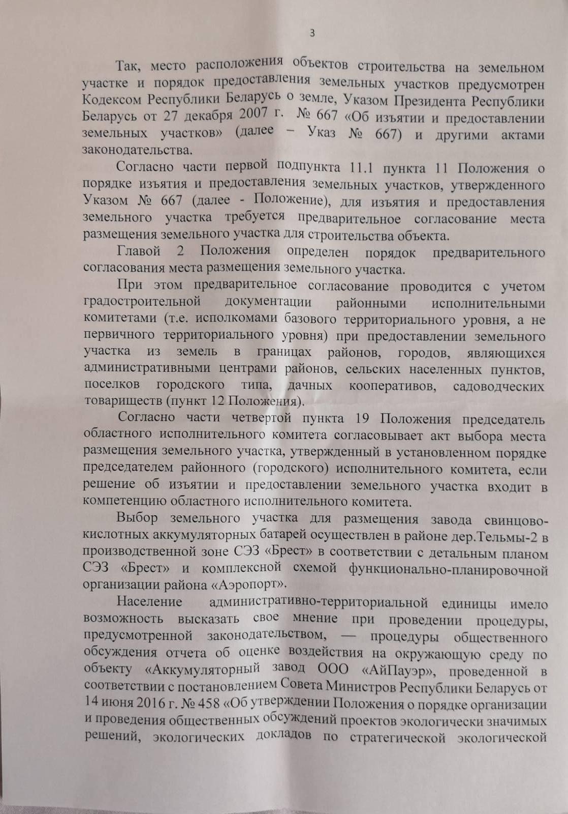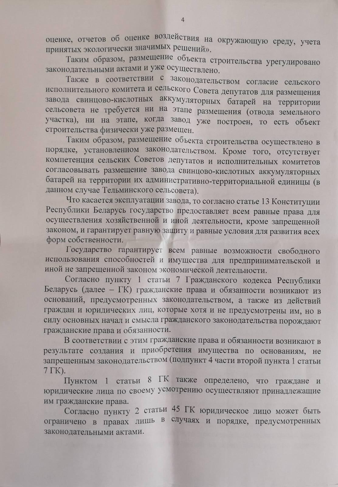 В отказе, который занимает семь листов, говорится, что в целом порядок образования инициативной группы соблюден, однако вопрос, выносимый на референдум, не соответствует требованиям законодательства – в компетенцию сельисполкома не входит вопрос размещения и эксплуатации предприятия, имеющего значение для всей страны. К слову, именно с такой формулировкой в регистрации инициативной группы по проведению местного референдума еще в январе 2019 года активистам отказал Брестский райисполком.
