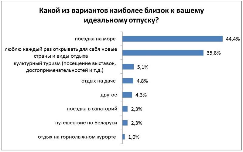 Идеальный вариант отпуска для 44,4% респондентов – поездка на море. Открывать для себя новые страны и виды отдыха предпочитают 35,8% опрошенных. Культурный туризм привлекает 5,1% респондентов. Дача – идеальное место для отпуска для 4,8% опрошенных. Не прочь съездить в санаторий – 2,3%. Ровно столько же участников исследования с удовольствием попутешествуют по Беларуси. Горнолыжный курорт в качестве идеального места для отдыха привлекает лишь 1% опрошенных.