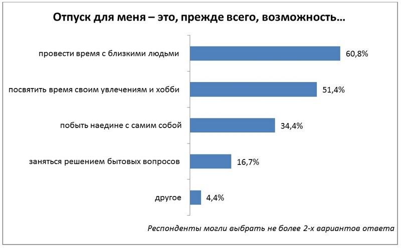 Отдых мечты для большинства респондентов – это возможность провести время с близкими людьми (60,8%) и уделить внимание своим увлечениям и хобби (51,4%). Случай побыть наедине с самим собой во время отпуска использует каждый третий опрошенный. Решению бытовых вопросов свой отпуск посвящают 16,7% участников исследования.