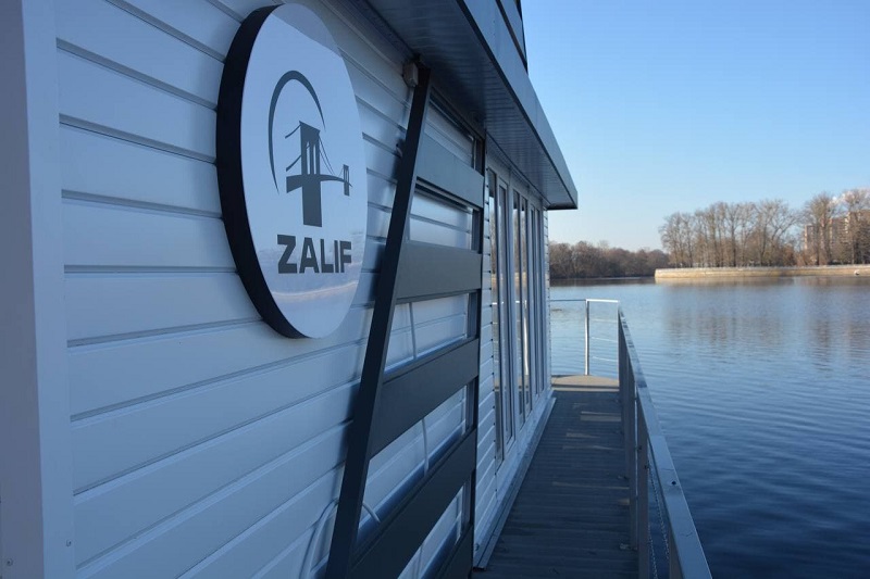 Название кафе связано с местом его дислокации – пришвартовано в заливе Мухавца. Эмблема кафе также содержит привязку к его месторасположению – на ней прорисован мост через реку. В настоящее время ZALIF может принять 24 клиента.