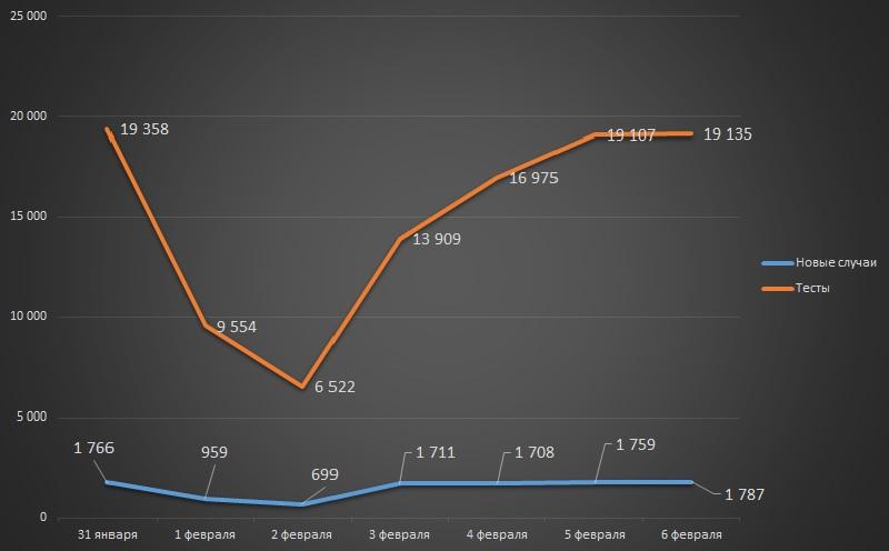 Продолжая следить за ковидными показателями в недельном цикле, можно сделать вывод, что заболеваемость, по официальной статистике, продолжает незначительно снижаться: если с 24 по 30 января (напомним, мы выбрали диапазон с воскресенья по субботу) в стране было выявлено 10 711 инфицированных, то за период с 31 января по 6 февраля – на 322 случая меньше (10 389).