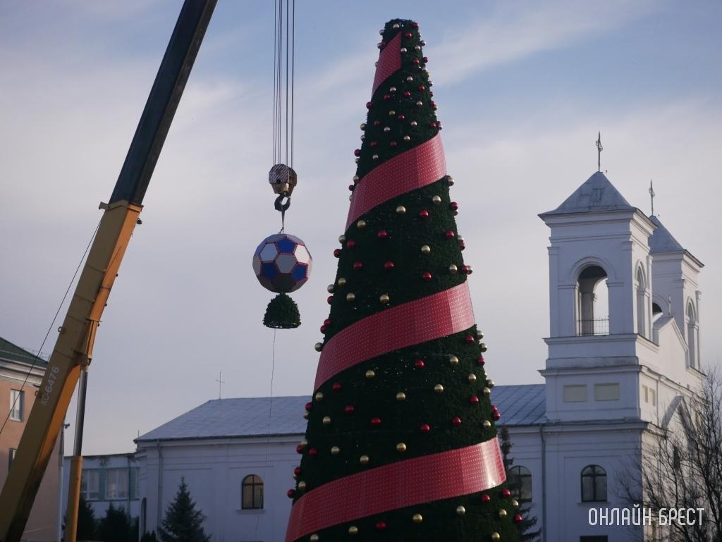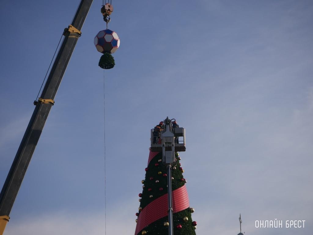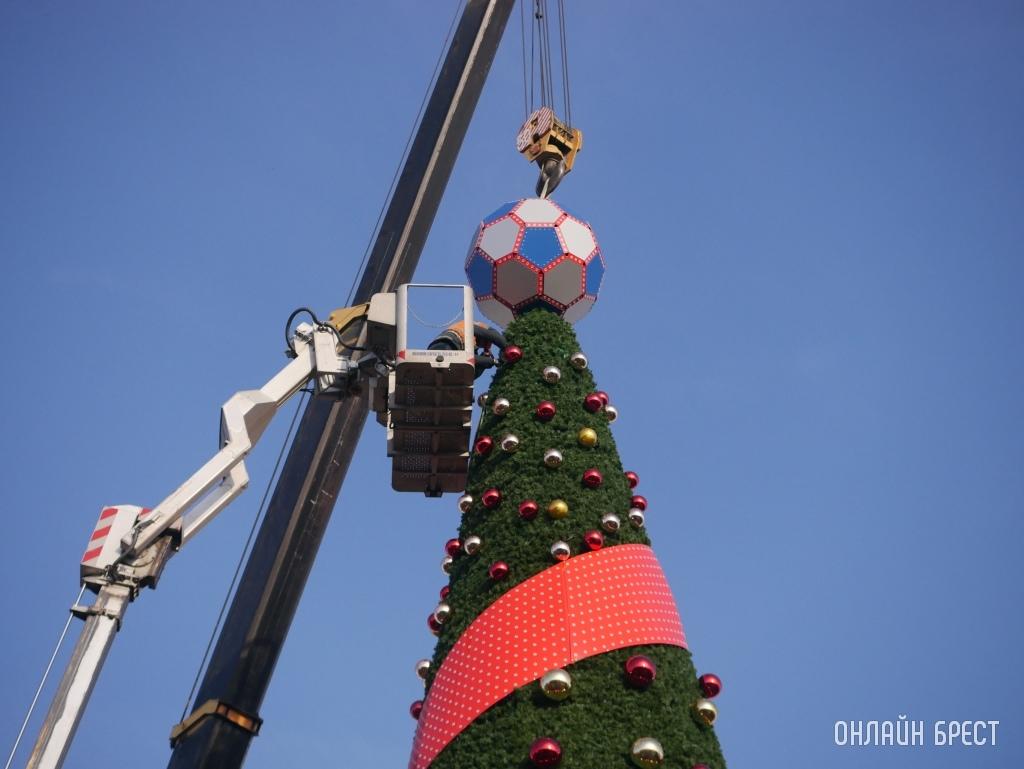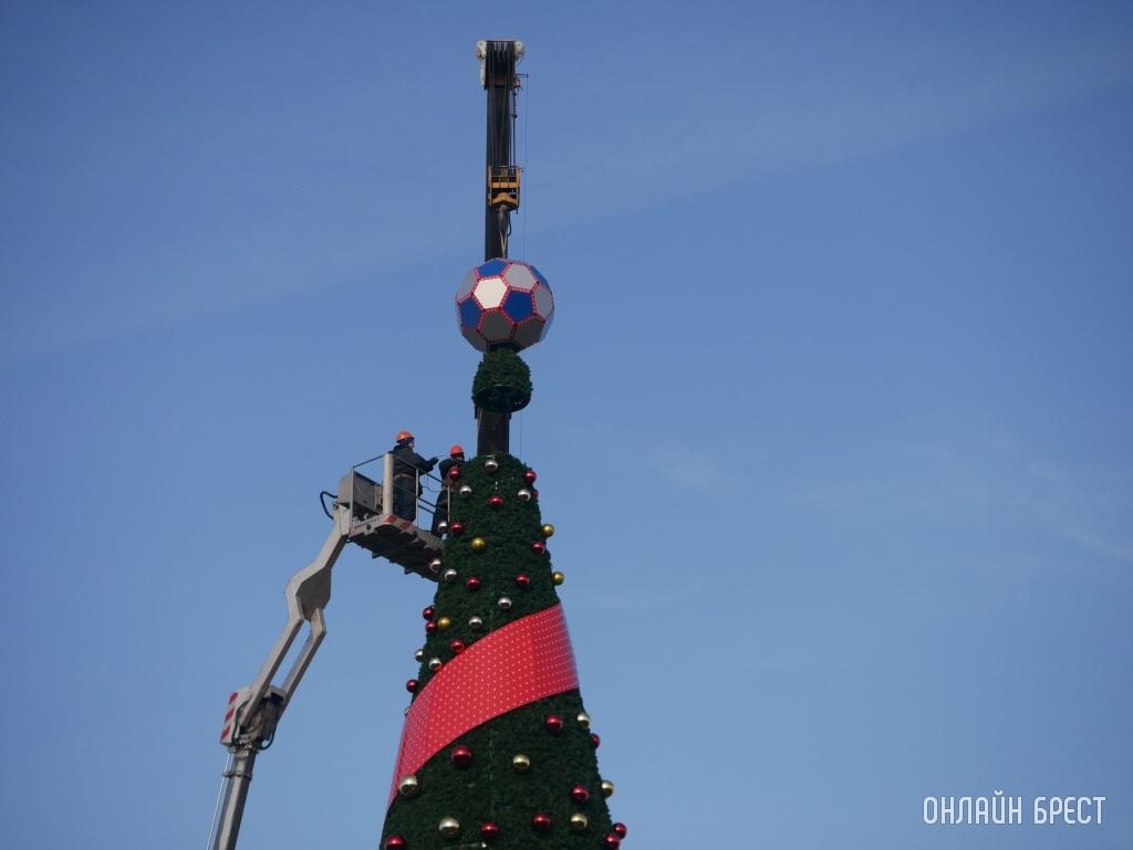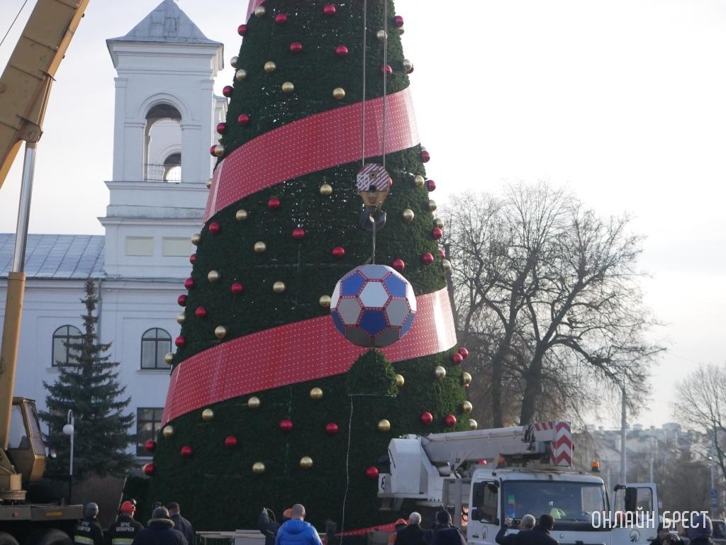 Днем 20 декабря на главной елке Бреста на площади Ленина появился обещанный футбольный мяч. Его установку запечатлел на фото «Онлайн Брест».