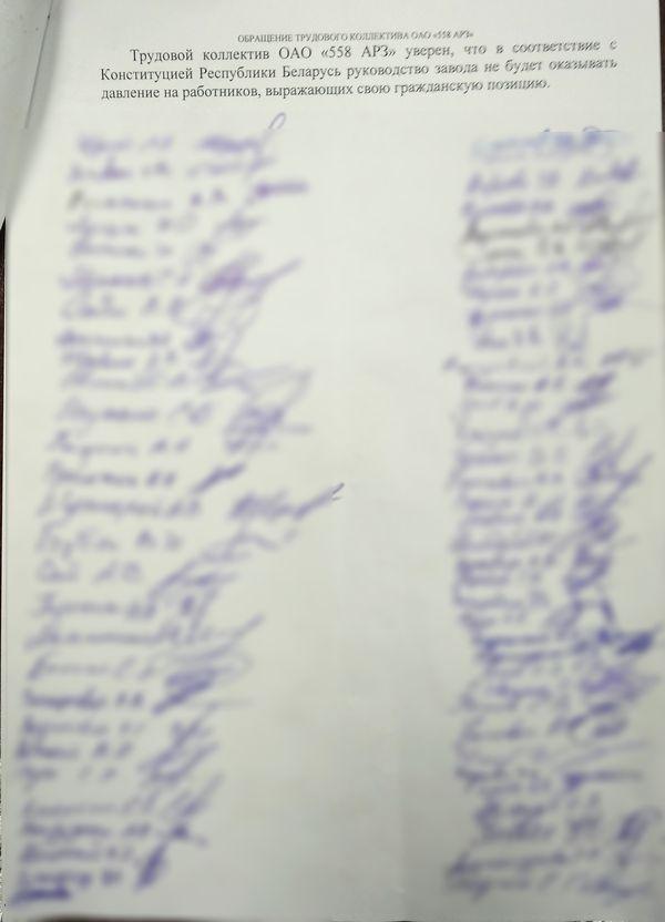 После того, как несколько работников ОАО «558-й авиационный ремонтный завод» были осуждены за участие в акциях протеста против фальсификации выборов, их коллеги написали коллективное обращение к городским властям. В числе главных требований – освобождение политзаключенных, отставка Александра Лукашенко и проведение честных выборов, сообщает Intex-press.