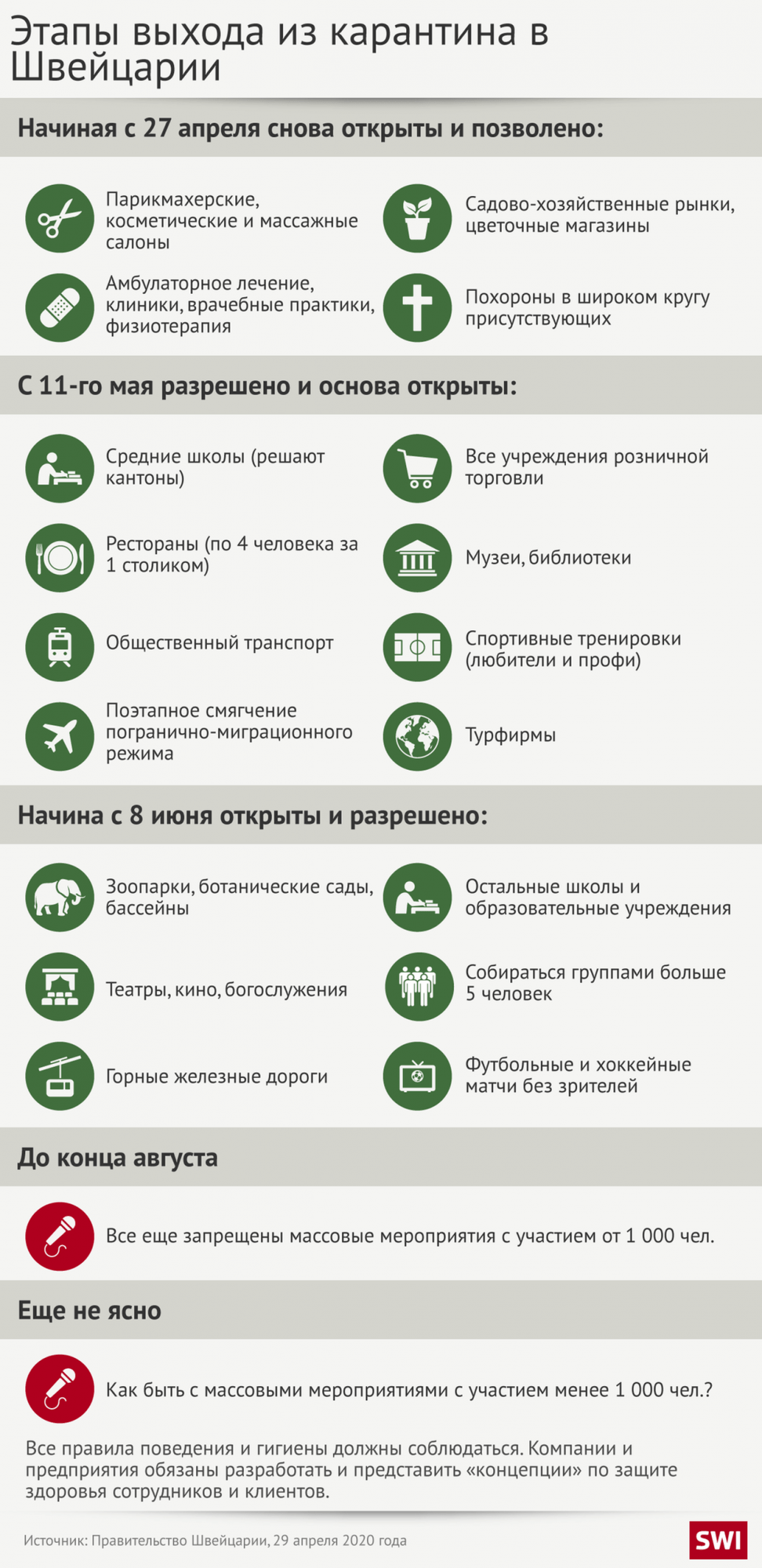 По словам властей страны, ограничения, введенные из-за коронавируса в середине марта, принесли свои плоды: распространение вируса замедлилось, и сейчас больницы не переполнены. С начала мая в Швейцарии ежесуточно фиксируется наименьшее количество новых случаев коронавируса за два месяца, что действует карантин.