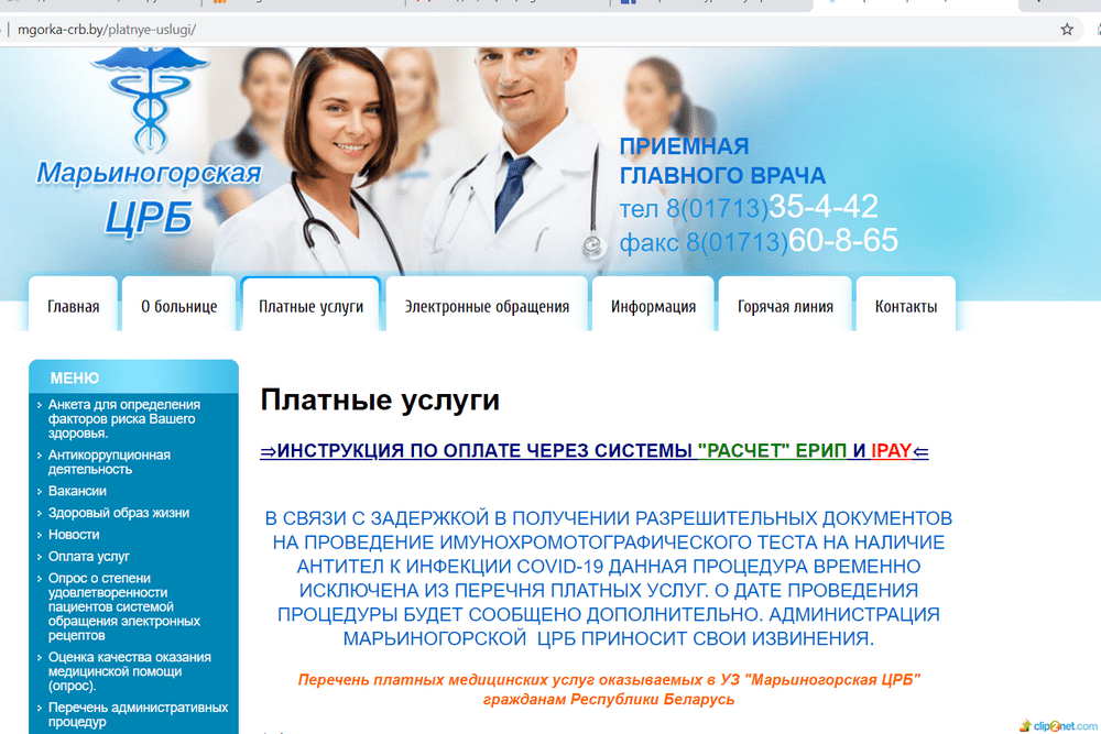 На сайте районной больнице в Марьиной Горке (Минская область) появилась информация о том, что на базе медучерждения начали делать платный экспресс-тест на антитела к коронавирусу. Результат становится известен через 10-15 минут.