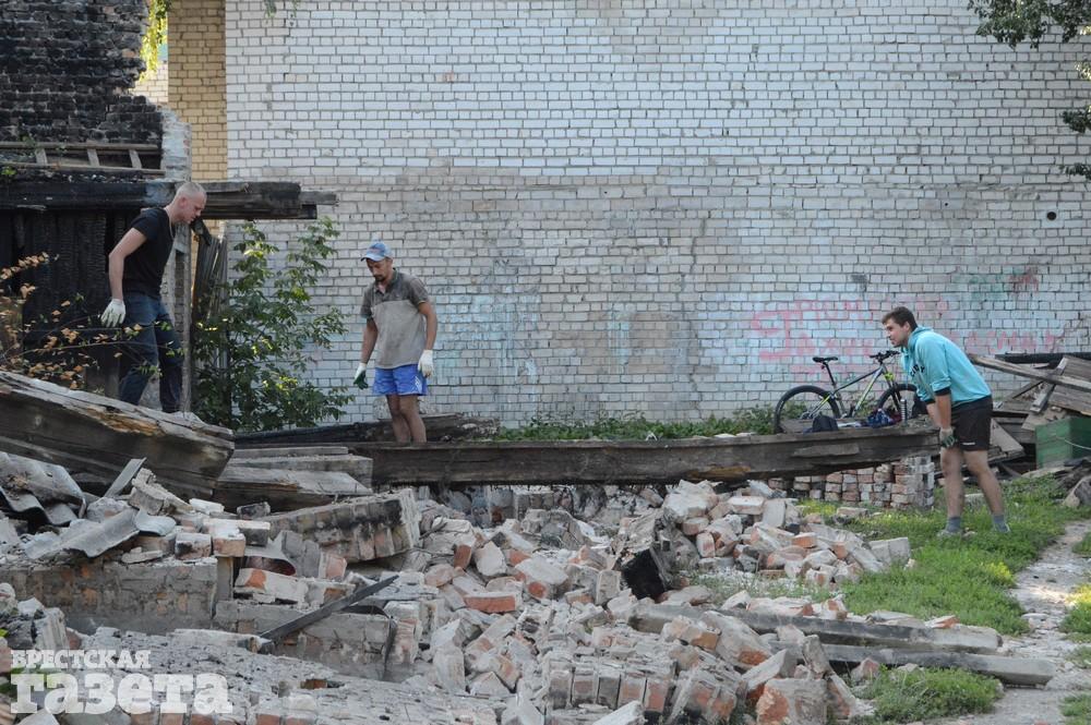 В центре Бреста, в квартале, ограниченном улицами Советская, Мицкевича, Комсомольская и Пушкинская, разбирают двухэтажный сарай послевоенной постройки. 5 и 6 августа корреспондент «БГ» наблюдала, как там ведутся работы. Рабочие вручную и при помощи техники разбирают сарай.