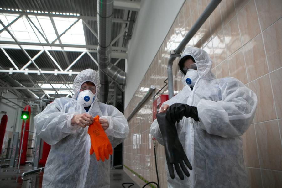 Обработка происходит следующим образом: на участок мойки транспорта заезжает автобус. Часть бригады уборщиков подвижного состава начинает приводить в порядок его салон. В сухую уборку входит подметание салона, в мокрую — помывка пола и протирание мест салона, соприкасающихся с пассажирами. Это все поручни, сиденья и двери, в том числе и место водителя. После этого в автобус заходит человек с распылителем в защитном костюме и маске, производит аэрозольную обработку дезинфицирующими веществами. Совсем скоро автобус уходит под большие и высокие щетки, которые смывают грязь с его корпуса. По соседней линии на участок заходит очередной автобус.