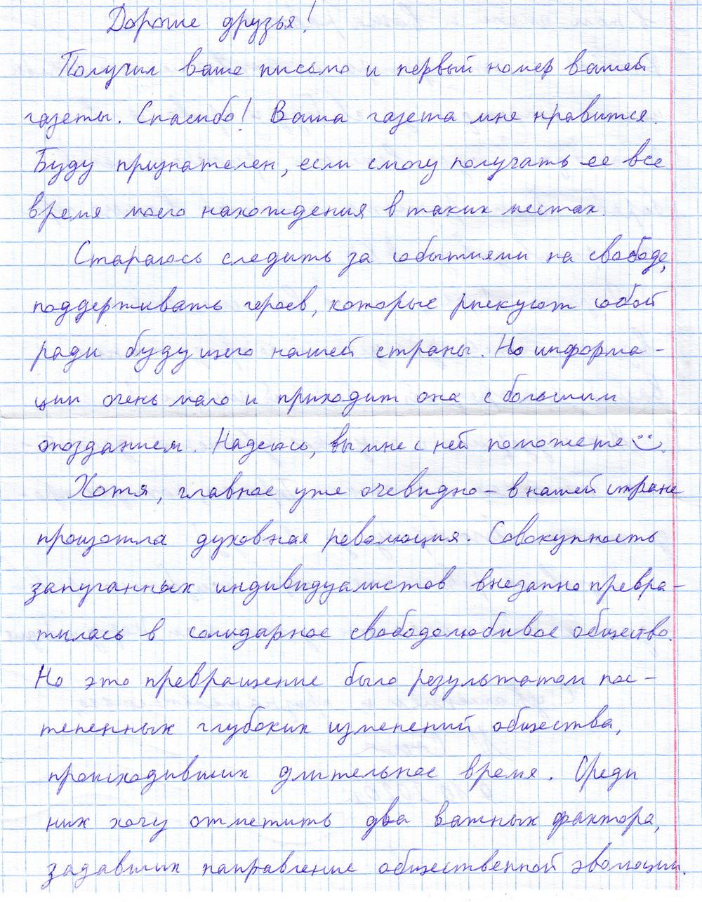 «Дорогие друзья! Получил ваше письмо и первый номер вашей газеты. Спасибо! Ваша газета мне нравится. Буду признателен, если смогу получать ее все время нахождения в таких местах.