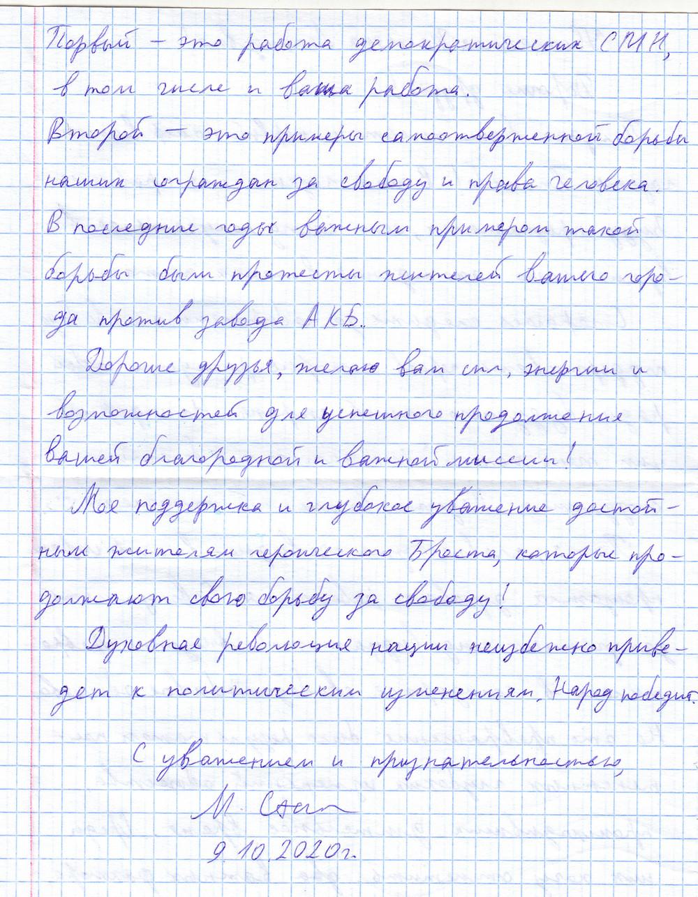 Редакция «Брестской газеты» получила письмо от политзаключенного Николая Статкевича, который находится под стражей с конца мая. Это письмо он написал 9 октября: