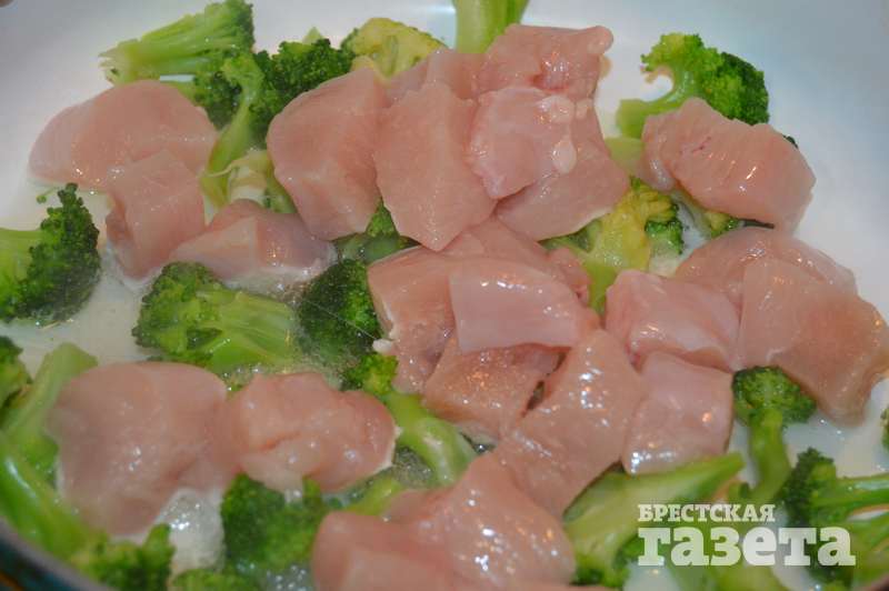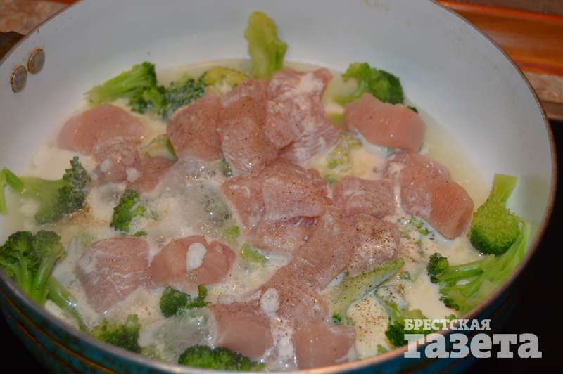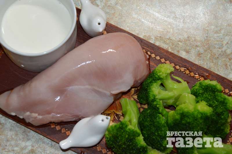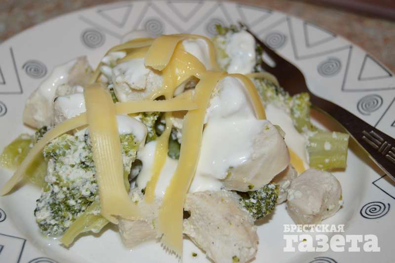 Надо: 0,5 куриной грудки, 300 г брокколи, 100 г сметаны, 30 г сыра, соль, перец по вкусу.