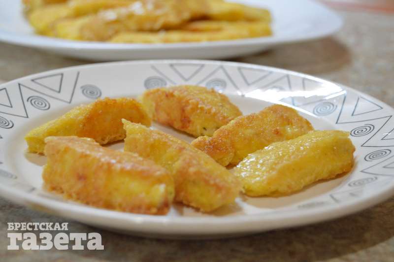 Надо: 500 г куриного филе, 200 г сыра, 2 яйца, 100 г муки, соль, приправы по вкусу, растительное масло для жарки.