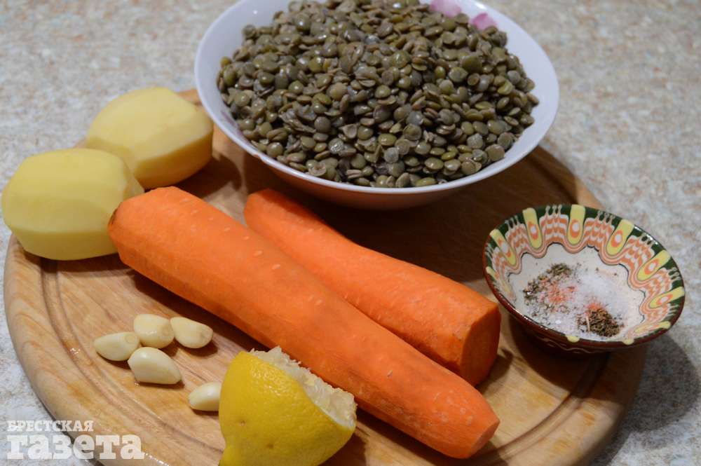 Надо: 1 ст. зеленой чечевицы, 1 картофелина, 1 морковь, 2-3 зубчика чеснока, 1 ч. л. сушеной зелени, 0,5 лимона, соль и перец по вкусу.