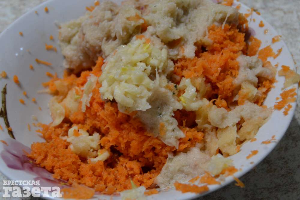 Картофель и морковь натрите на мелкой терке. Добавьте чеснок, пропущенный через пресс. Сбрызните соком половинки лимона.