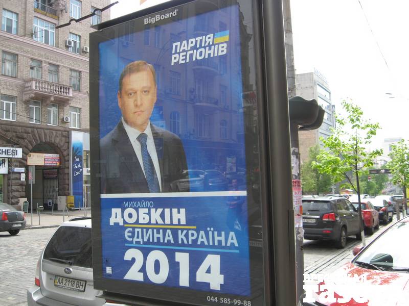 Добкин баллотируется от Партии регионов и выступает под лозунгом «Единая страна». Владелец кондитерской фабрики «Рошен», миллионер и лидер предвыборной гонки Петр Порошенко предлагает избирателям «Жить по-новому», а Олег Ляшко (такая украинская инкарнация Жириновского) обещает вернуть Крым, правда, не уточняет каким образом. Что касается Тимошенко, то, как ни удивительно, ее предвыборных плакатов заметно не было.