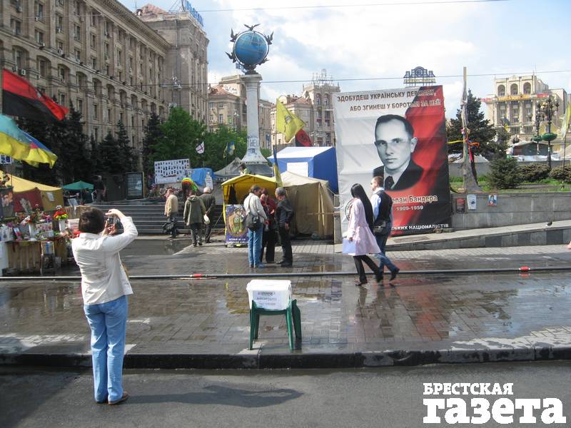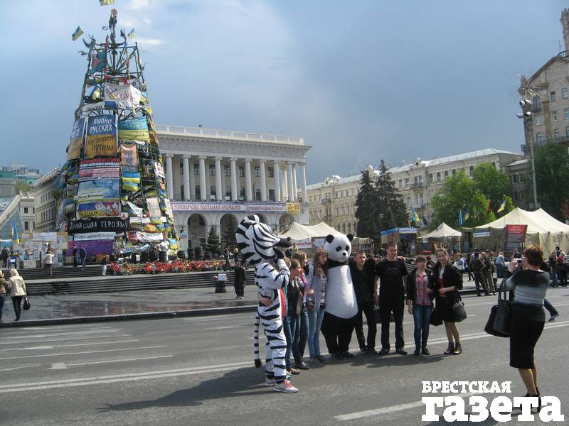 Вообще кажется, что туристов, журналистов и просто зевак на Майдане больше, чем сил самообороны, во всяком случае, визуально. То тут, то там люди с фотоаппаратами позируют друг другу на фоне сцены, баррикад и потрепанных армейских палаток. У огромного плаката с изображением Степана Бандеры какая-то старушка отчитывает одного из майдановцев: «Снять плитку сняли, а назад кто ложить будет?» Чуть поодаль другая старушка дает наставления группке скучающих активистов: «Ну теперь смотрите, чтоб и пенсия была, и чтобы не воровали!» Неподалеку от них рослый мужчина в камуфляже дает интервью какому-то телеканалу. В центре площади, прямо под «елкой», веселые ребята в костюмах зебры и панды пристают к прохожим, предлагая сфотографироваться. Многие соглашаются.