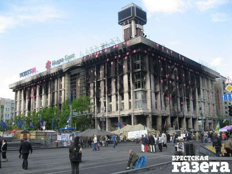 При выходе на поверхность сразу замечаешь закопченную громаду сожженного Дома профсоюзов, от которого до сих пор явственно пахнет гарью. Неподалеку от него — пустующая сцена с растяжками «Христос воскрес!» и «Воскресает Украина!».
