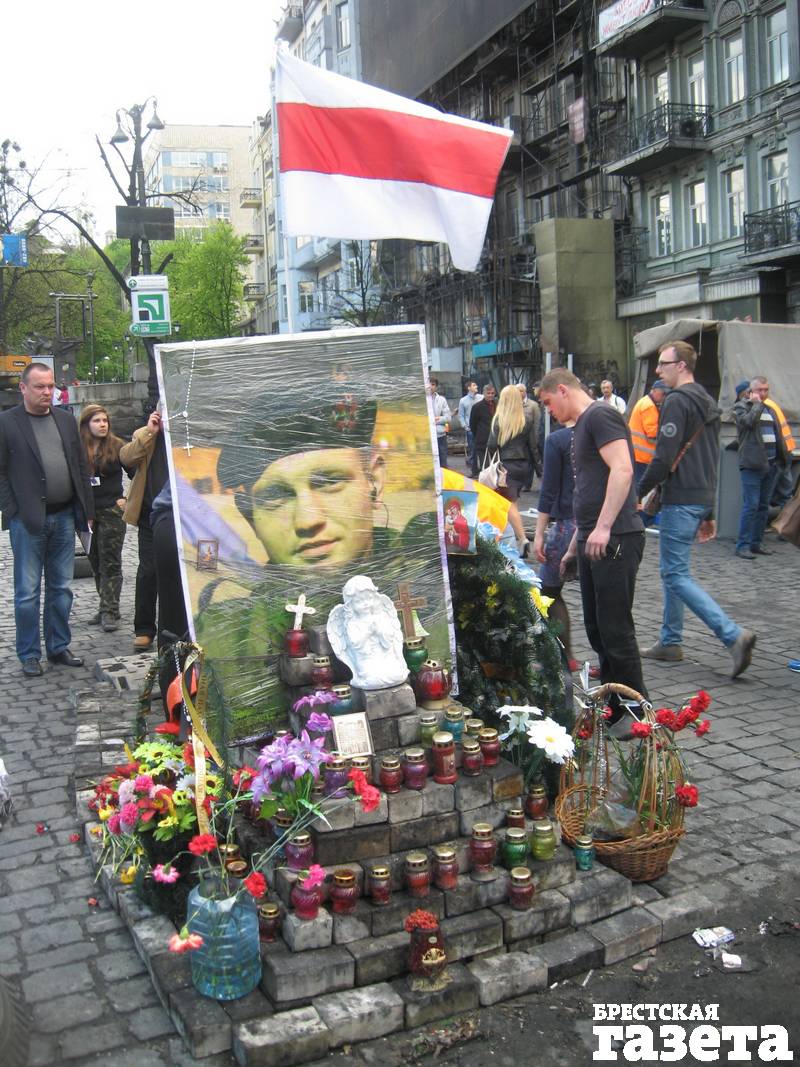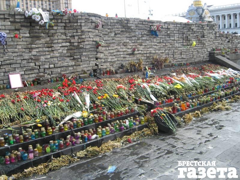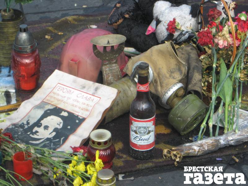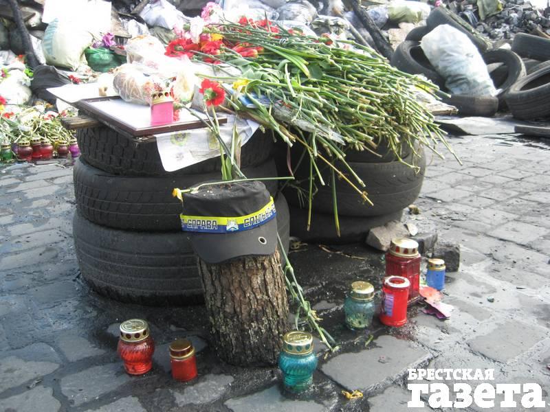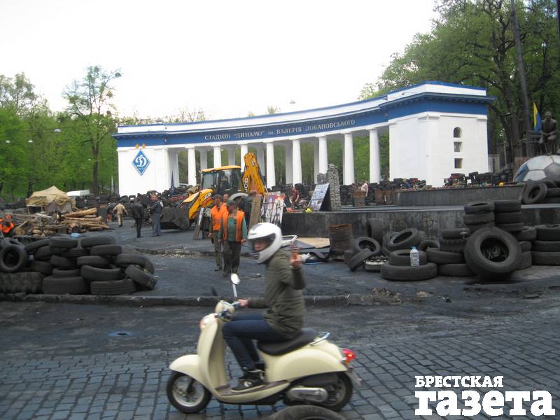 На улице Грушевского колоннада у входа на стадион до сих пор заставлена шинами и горами плитки. Прямо посреди проезжей части — сложенный из тротуарной плитки мемориал с портретом Михаила Жизневского, белоруса, погибшего во время столкновений с «Беркутом». Над портретом развевается бело-красно-белый флаг.