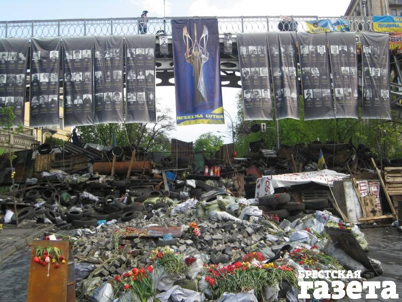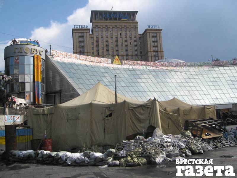 У сцены стоит здоровенное распятие, у его подножия — иконы и цветы. По всей территории Майдана — палатки, баррикады, бесчисленные флаги ЕС и Украины. Некоторые подходы к площади все еще заблокированы. Каркас для новогодней елки, завешанный плакатами, до сих пор стоит рядом с памятником Независимости (та самая знаменитая колонна в центре площади, увенчанная статуей девушки в национальном костюме). За памятником в окружении шин, мешков с песком и палаток расположен торговый центр «Глобус».