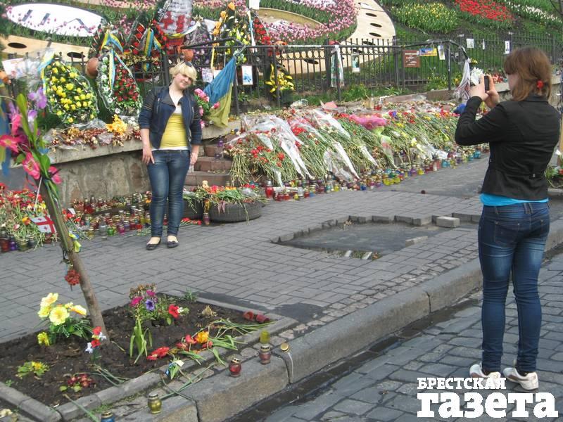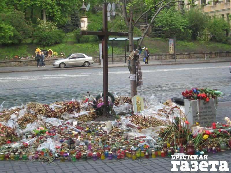 На мосту рядом с «Глобусом» висит огромная растяжка с портретами «Небесной сотни». Дорога к ней уставлена венками и лампадами, встречается и несколько самодельных мемориалов — небольших, собранных из тротуарной плитки постаментов, на которых стоят фотографии погибших и лежат цветы. У некоторых из них робко фотографируются школьники.