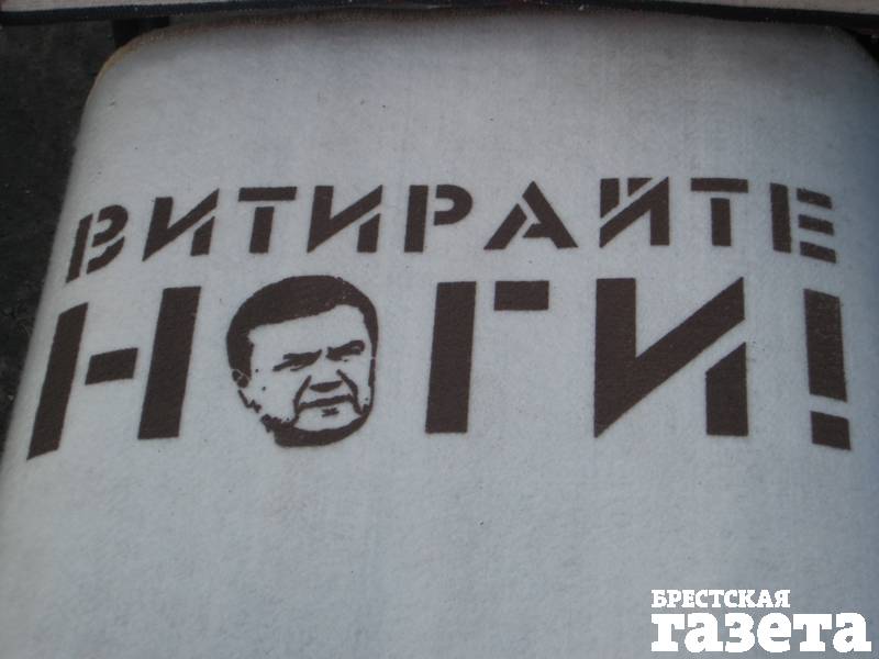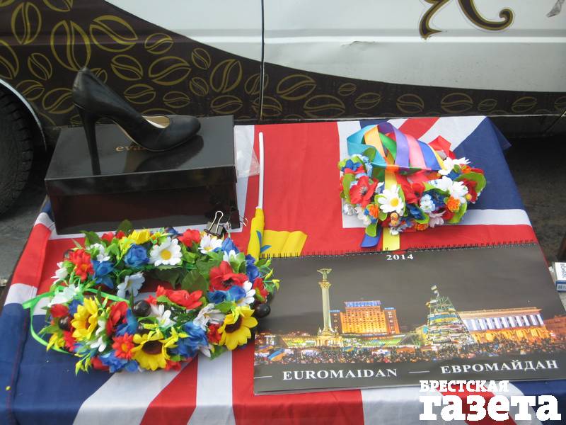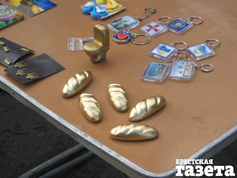 Мигом ухватили дух времени и производители сувениров. Теперь на Майдане можно купить магниты в виде золотых батонов и золотых унитазов, коврики с надписью «Вытирайте ноги», где букву «о» заменяет портрет Януковича, футболки всех видов и расцветок: от привычной «Дякую тобi, боже, що я не москаль» до портретов Тараса Шевченко и символики «Правого сектора». Один из торговцев рядом с пластиковыми украинскими венками, календарем с фотографиями ночного Майдана и почему-то флагом Великобритании выставил на продажу черные женские туфли на шпильке. А на перекрестке с улицей Грушевского улыбчивый молодой человек предлагает всем желающим приобрести «воздух с Майдана», закатанный в небольшие консервные банки с желто-синими этикетками. Спрашиваю у него, как идет торговля. «Неплохо», — не переставая улыбаться, отвечает продавец.