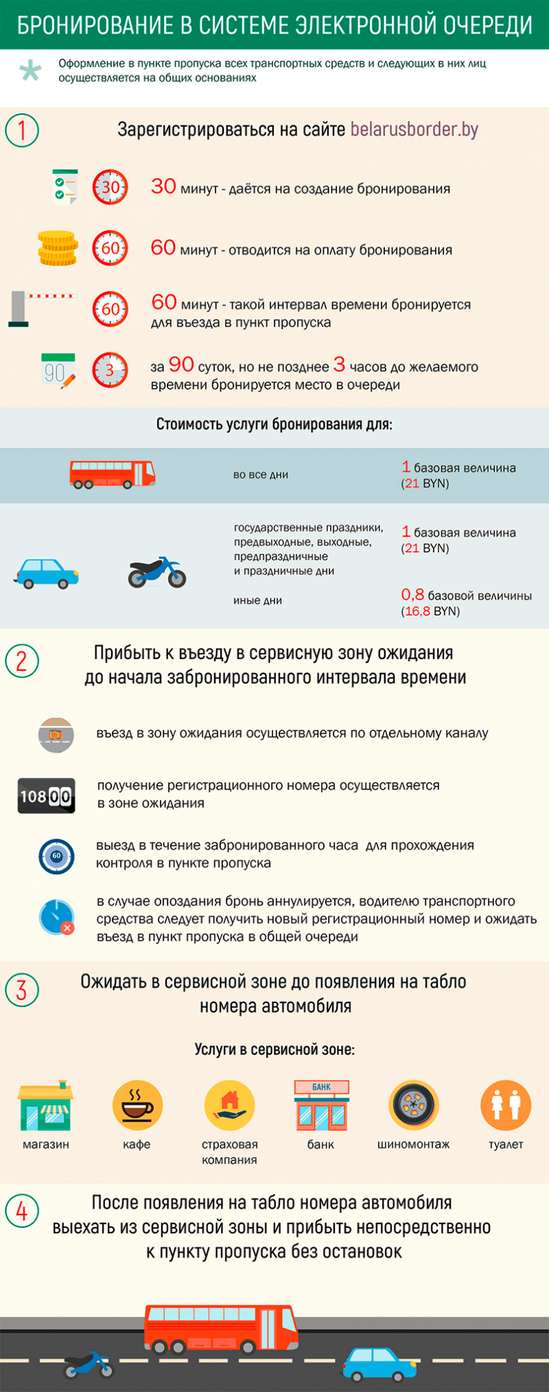 Прибыть в зону ожидания надо до начала времени бронирования. Въезд в нее осуществляется по отдельному каналу. Там вы получите регистрационный номер и останетесь ждать, пока номер вашего авто не появится на табло. Кстати, в сервисной зоне есть магазин, кафе, страховая компания, банк, шиномонтаж и туалет. После появления на табло номера вашего автомобиля следует выехать из сервисной зоны и прибыть к пункту пропуска без остановок.