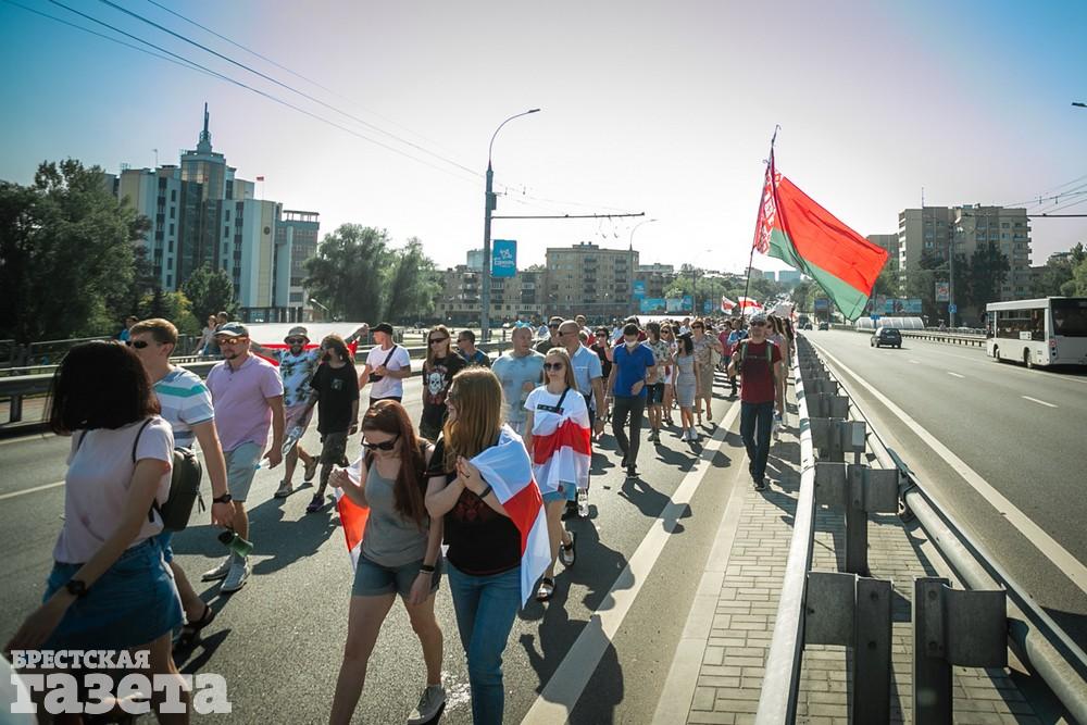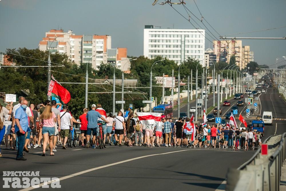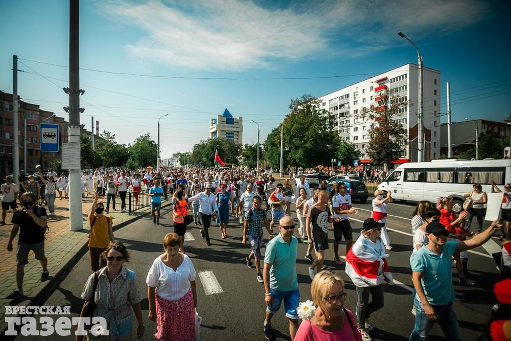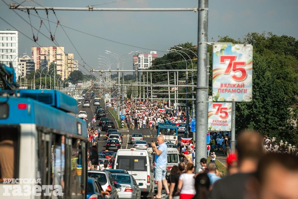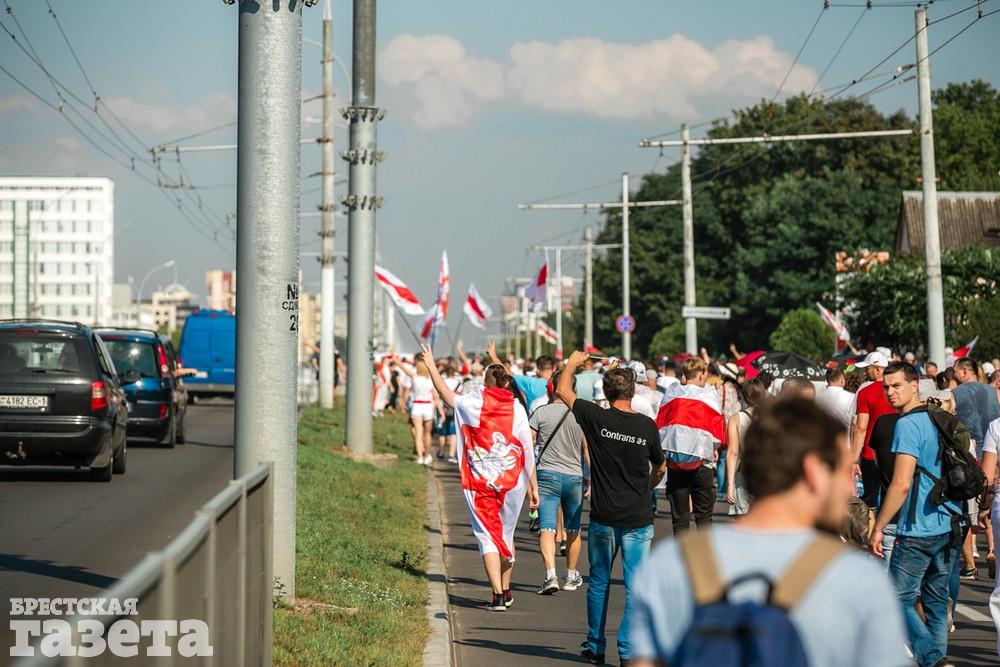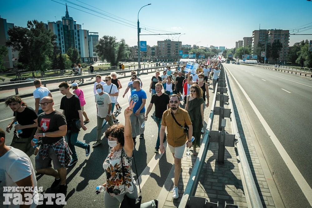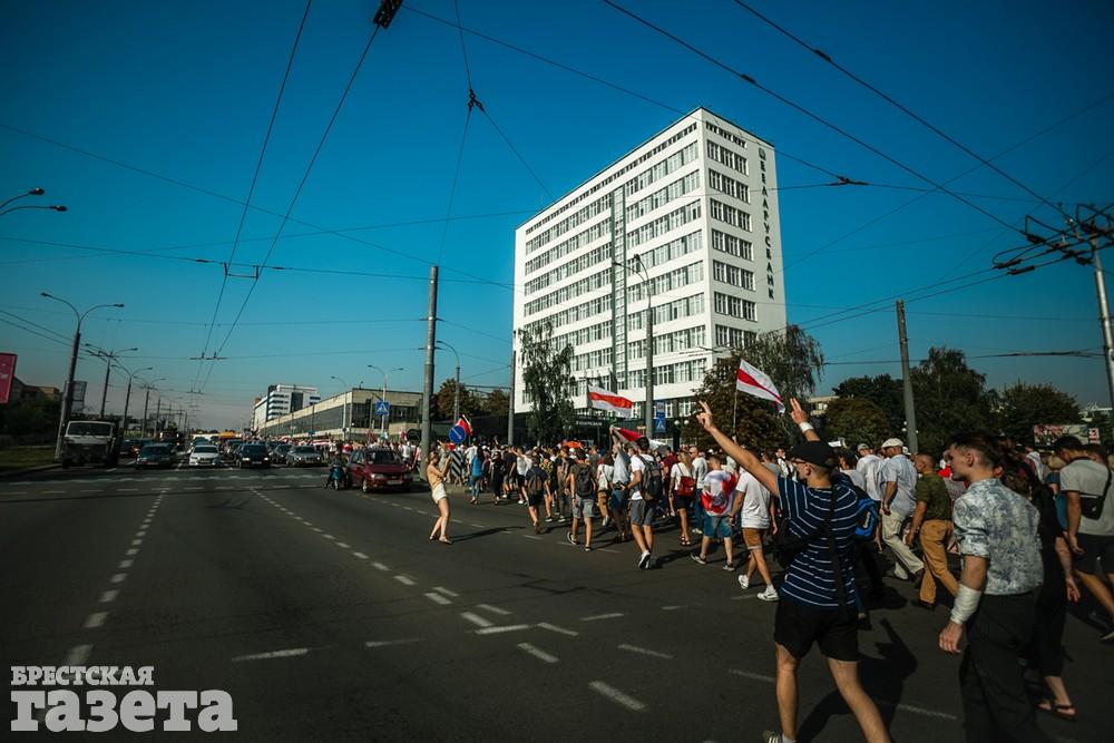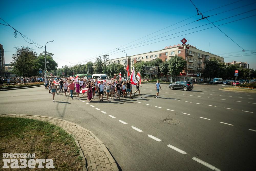 В этот день колонна протестующих выбрала новый маршрут для шествия. Из центра люди поднялись на Кобринский путепровод, пошли по улице Московской и свернули на Пионерскую. Оттуда они вышли на Пушкинскую, через которую вернулись в центр.