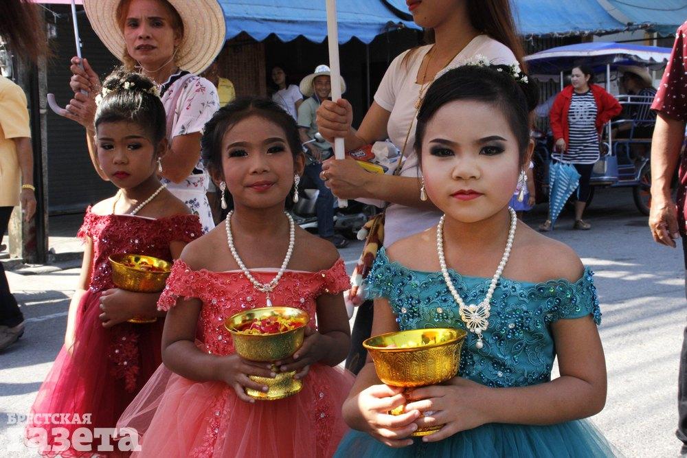 Три тайские девочки — участницы большого, пышного парада в день свадьбы их родственницы. Традиционно девочки несут в руках чаши с лепестками цветов, чтобы посыпать ими дорогу молодым. Для этого их наряжают в лучшие платья, обвешивают украшениями и делают полный макияж — все как у взрослых.