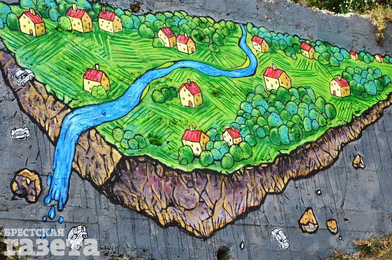 Уличный художник Предок разрисовал новый объект на Форте IV. На основной части изображена деревня с зелеными полями и полноводной рекой. От нее «отколота» атомная станция.