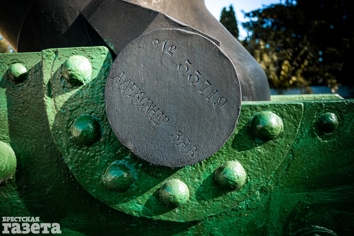На теле мортир имеются шифровки. Эти сокращения и цифры пробивались на цапфах и казенных частях орудий при изготовлении. Разберем одну из таких, установленную в Кобрине.