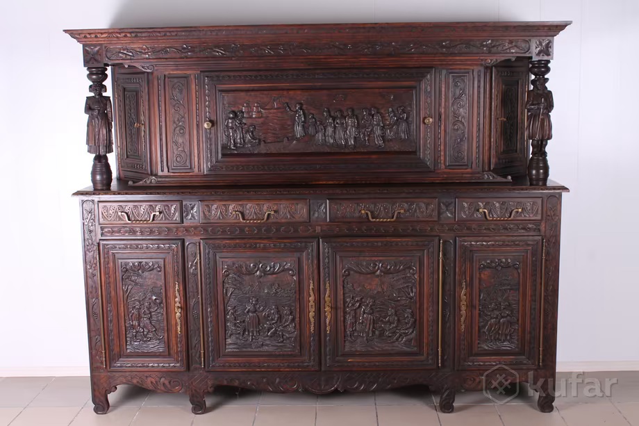 Из всей мебели на Kufar.by этот резной буфет оказался самым дорогим предметом мебели. В эффектности ему не откажешь. Украшен художественной сюжетной резьбой, выполненной вручную. Продавец пишет, что вещь вместе со всеми замками, петлями и ручками в идеальном состоянии, ключи в наличии. Буфет состоит из двух уровней, которые соединяют объемные фигуры. Имеет семь резных дверей и три выдвижных ящика. «Уникальная вещь», – резюмирует продавец. Жаль только, что в описании нет информации, сколько лет изделию.