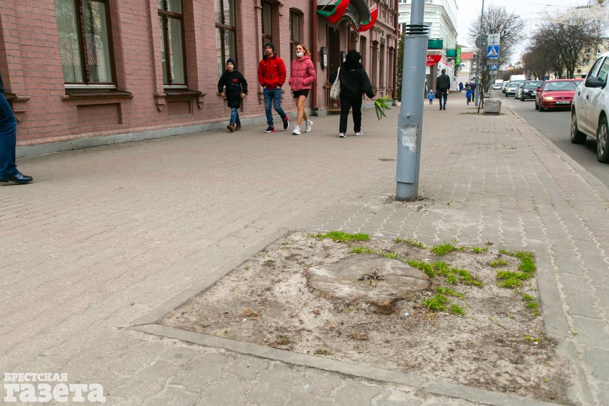 Если и были причины для удаления старого дерева, то было бы логично сразу довести начатое до конца. То есть посадить новое дерево или заложить пустующее место в уровень тротуарной плиткой. Стоит отметить, что в некоторых местах центра, хоть и крайне медленно, это уже делается.
