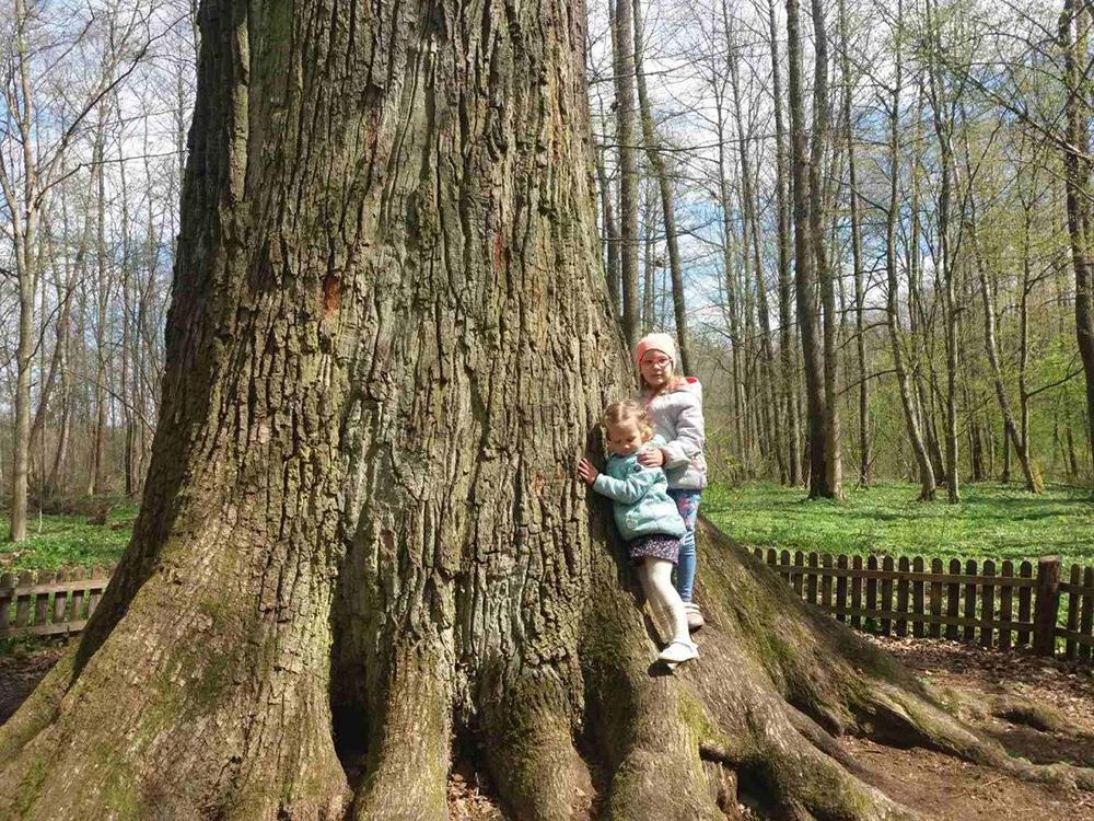 Падарожжы па Беларусі. Дочкі Таццяны каля дуба, які лічыцца найстарэйшым у Беларусі (Маларыцкая лесагаспадарка). Фота з асабістага архіва