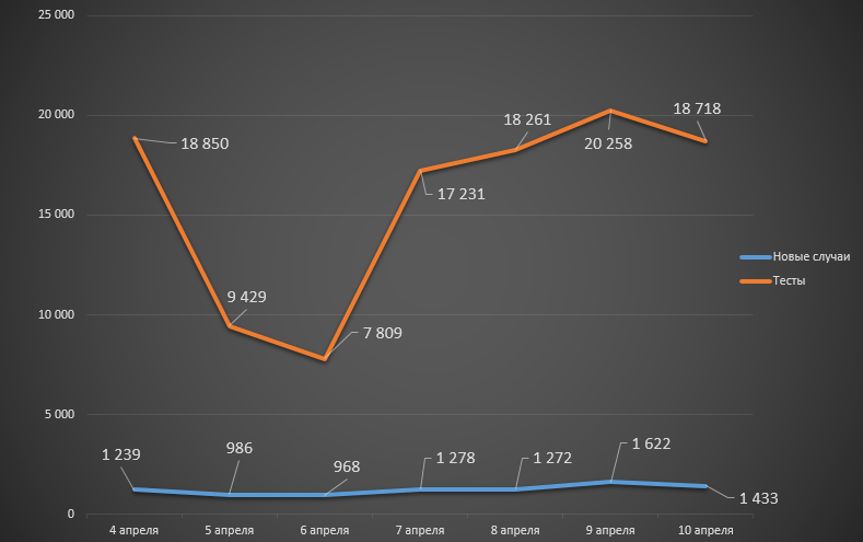 Что касается количества выполненных тестов, то за период с 4 по 10 апреля их было 110 556 (на предыдущей неделе – 114 177), а официальная смертность поднялась на 3: неделей ранее было зафиксировано 65 летальных исхода, за последние исследуемые семь дней – 68.