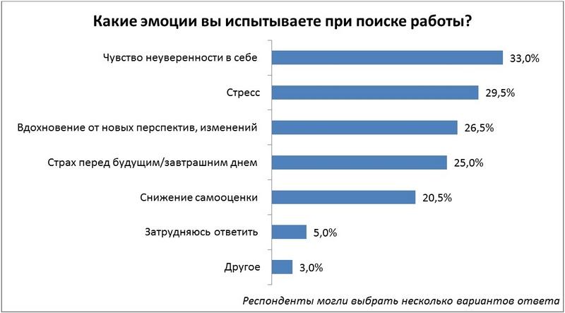 При поиске новой работы 33% опрошенных признались, что испытывают неуверенность в себе. Стресс сопровождает 29,5% респондентов. При этом 26,5% участников исследования одновременно испытывают вдохновение от новых перспектив и изменений.