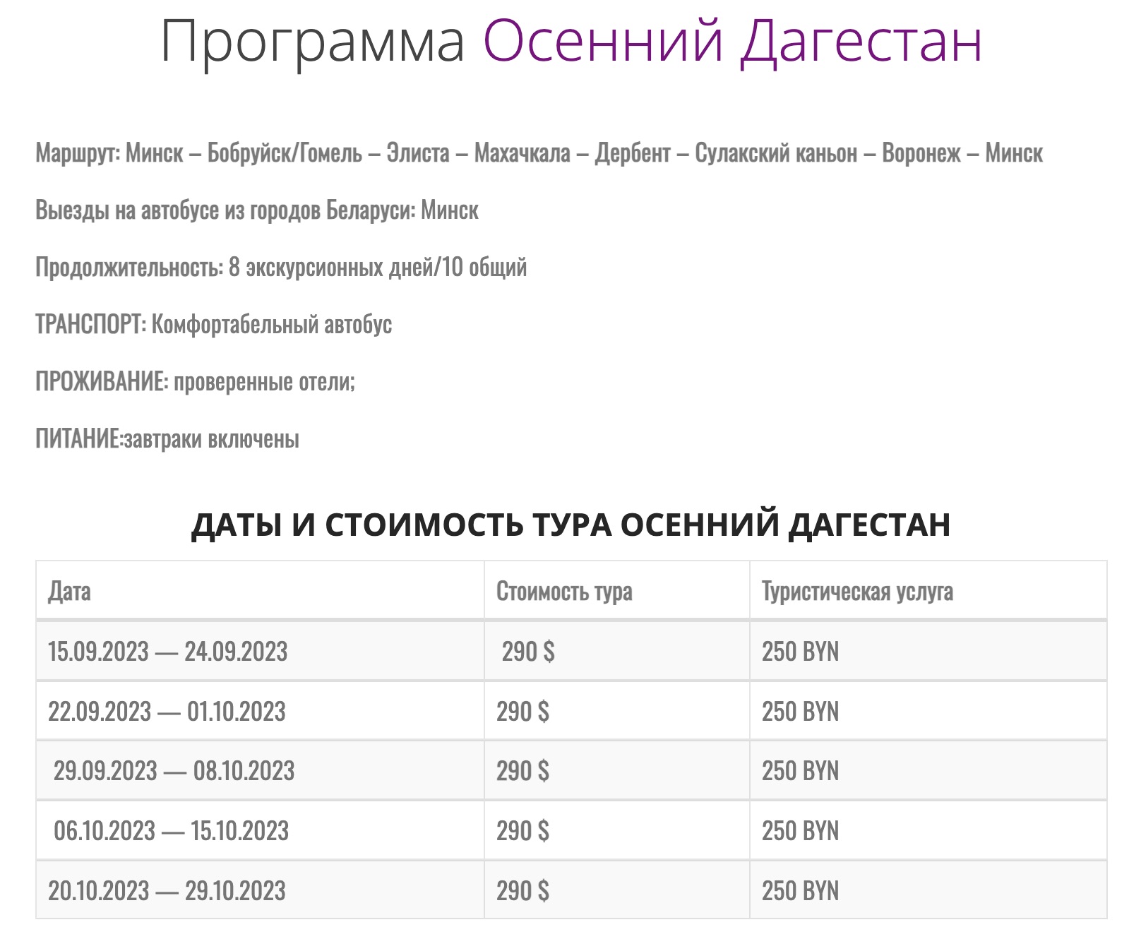 Еще у одного туроператора нашлась путевка «Большое путешествие в Дагестан». Его стоимость — $300 и 100 BYN. Продолжительность тура — 10 дней.