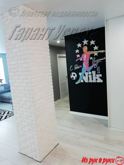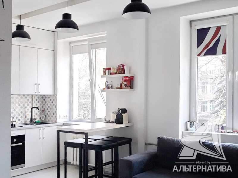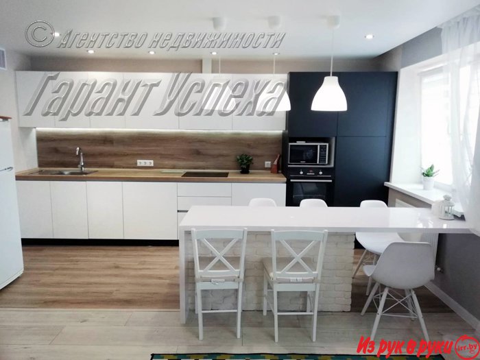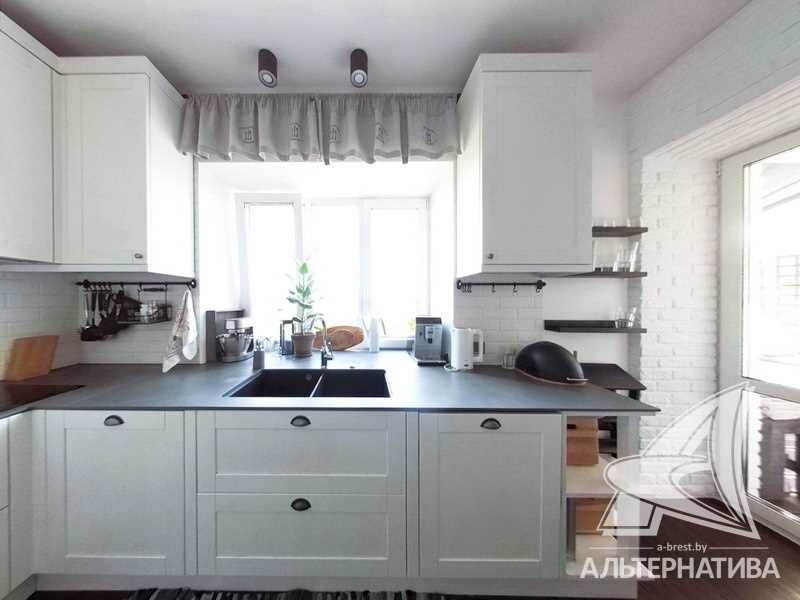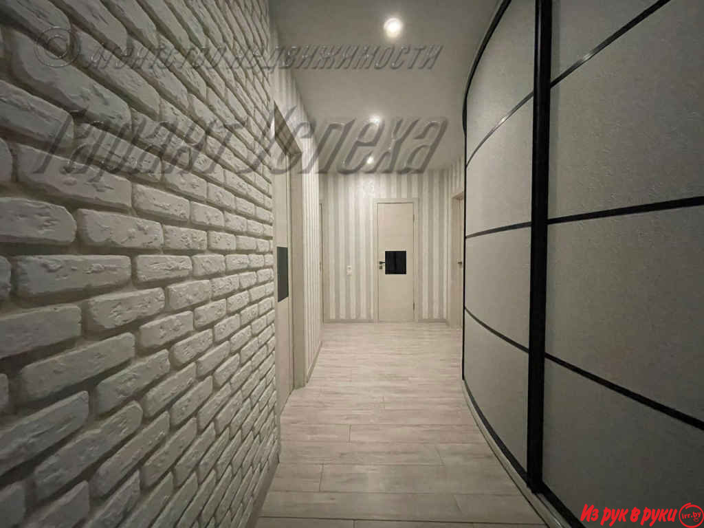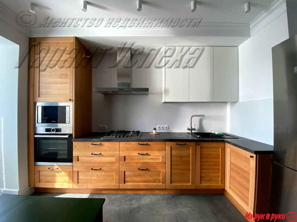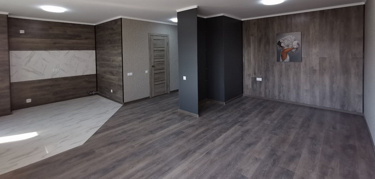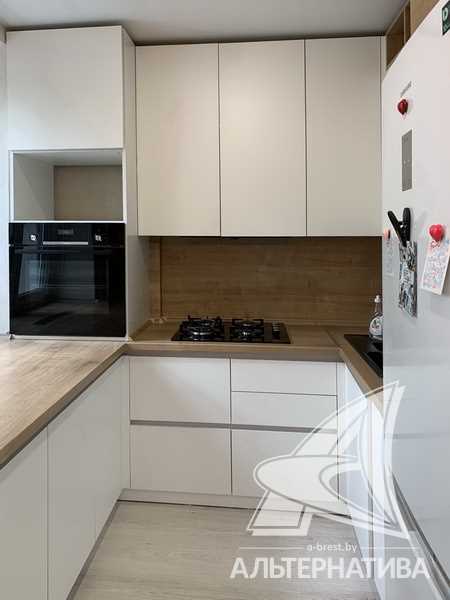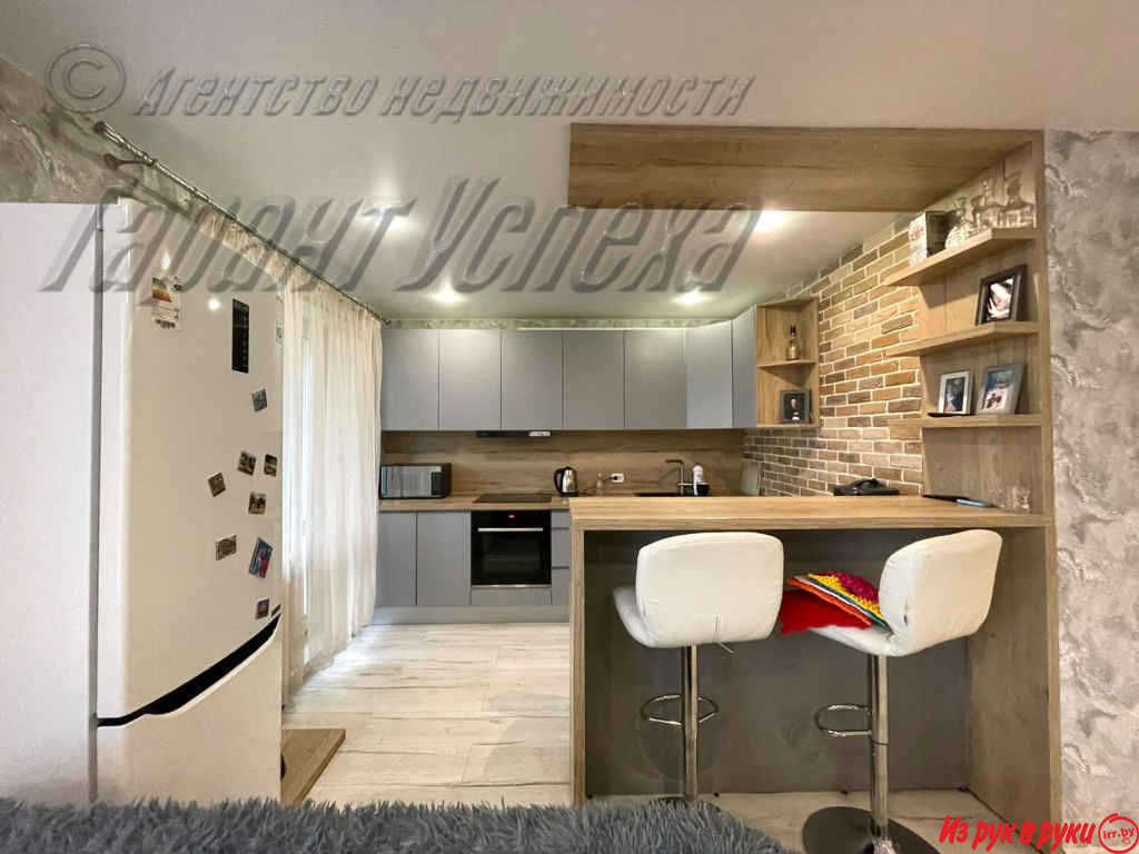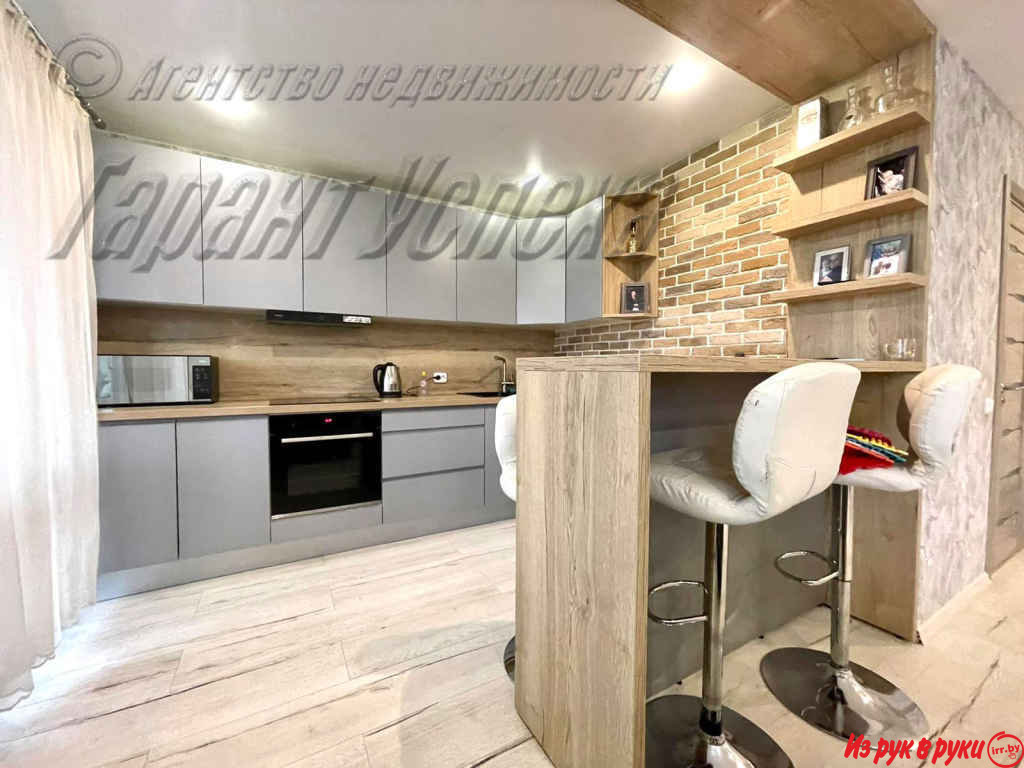 В квартире хозяева сделали дизайнерский ремонт. Оттенки серого и бежевого цветов сочетаются с натуральной текстурой дерева и имитацией кирпичной кладки. Стены оклеены обоями. Кухонный гарнитур со встроенной бытовой техникой: варочная поверхность, духовой шкаф, вытяжка.