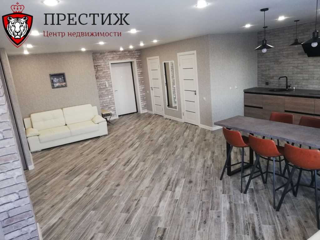 Трехкомнатную квартиру-студию продают в 18-этажном доме на улице Папанина. Общая площадь с лоджией — 85,8 квадратных метра. По словам хозяев, в квартире выполнен дизайнерский ремонт: натяжные потолки, декоративный камень на стенах, поклеены обои, на полу лежит ламинат и плитка, две застекленные лоджии. Квартиру продают со всей мебелью и техникой.