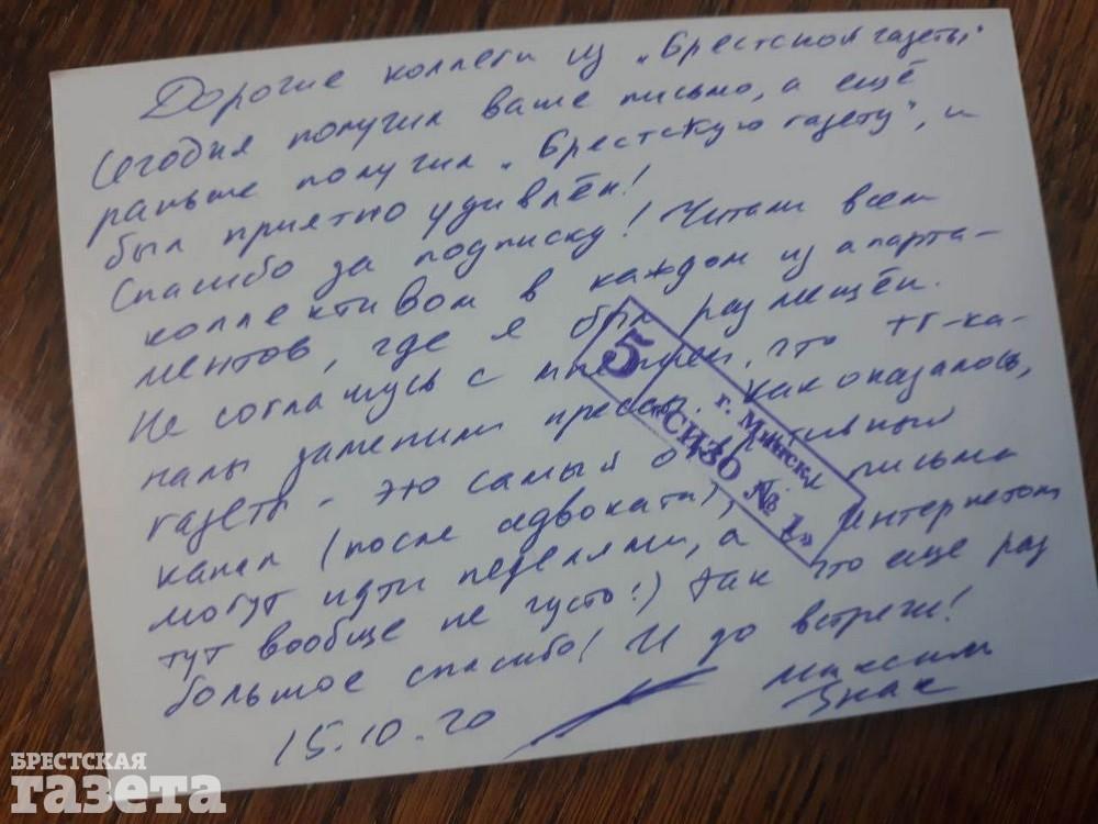 Открытка от юриста и адвоката Максима Знака, который третий месяц находится в СИЗО на Володарского в Минске, пришла 19 ноября. Датирована она 15 октября — если Максим не ошибся, то шла она больше месяца. Вот что он пишет.