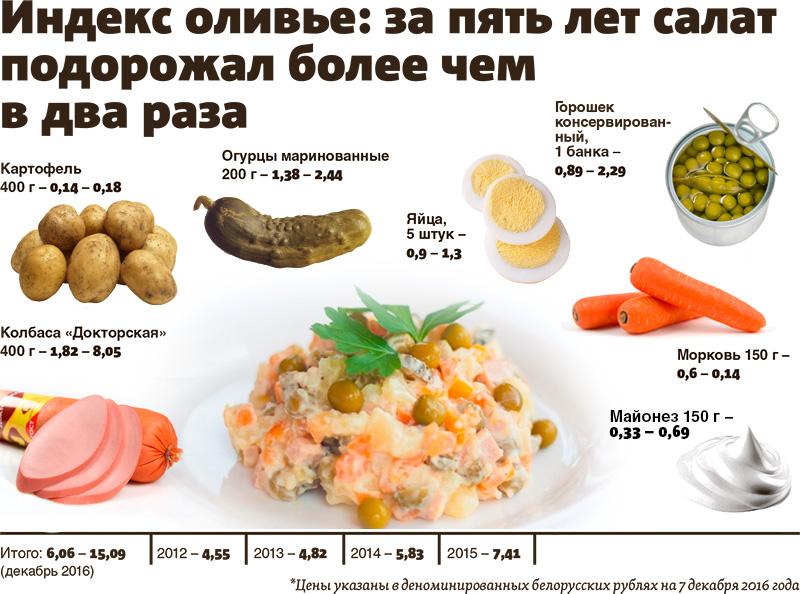 «БГ» в преддверии Нового года промониторила цены в магазинах трех крупных торговых сетей Бреста и составила индекс оливье. В итоге получилось, что стоимость миски оливье для брестчанина может колебаться от 6,06 до 15,09 белорусских рублей. Выходит, в среднем салат обойдется в 10,58 рубля, что более чем в два раза превышает его стоимость пятилетней давности.