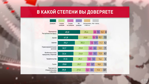 Вторая целевая группа, на которую направлено, — тут как раз таки разгоняют телеграм-каналы, ОНТ, а не БТ — это так называемое болото. У них тоже сегментизировано информационное поле, причем они не пересекаются как со сторонниками Лукашенко, так и с невероятными (точнее, пересекаются, но очень ограниченно). На них идет работа: «вот видите, сторонников Лукашенко большинство». И тут вопрос не в цифрах. Недоверие к данным от власти всегда есть. Но: «Ох, если 70%, то, наверное, было реально процентов 50 точно».