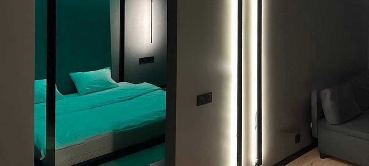 Отдельное внимание — разноплановой системе освещения. Начиная замысловатой конструкцией на кухонном потолке, заканчивая подсветкой зеркала, панелей и кровати в спальне. Судя по фото, цвет можно менять в зависимости от предпочтений или настроения.