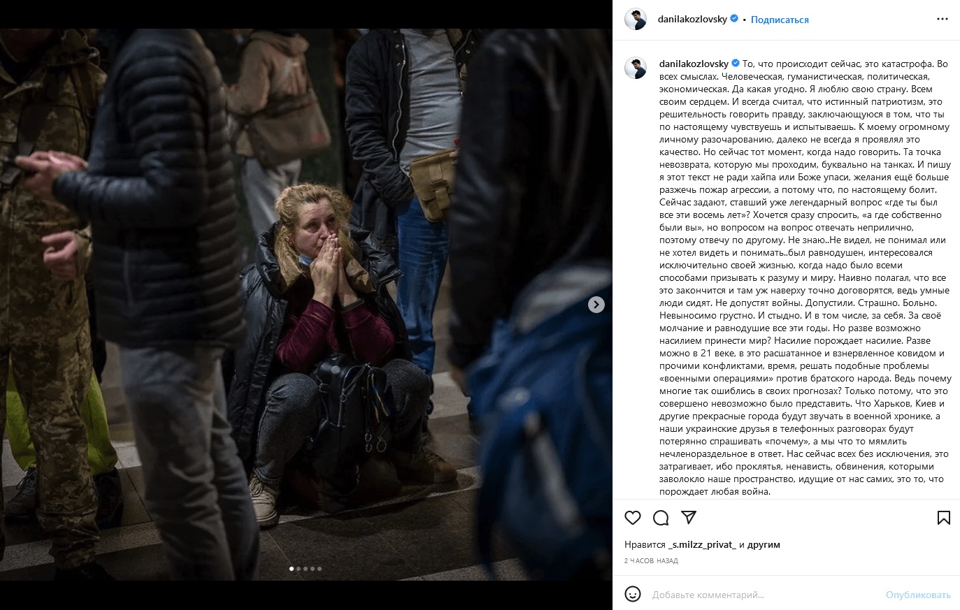 Антивоенный пост Данилы Козловского на своей странице в Инстаграм