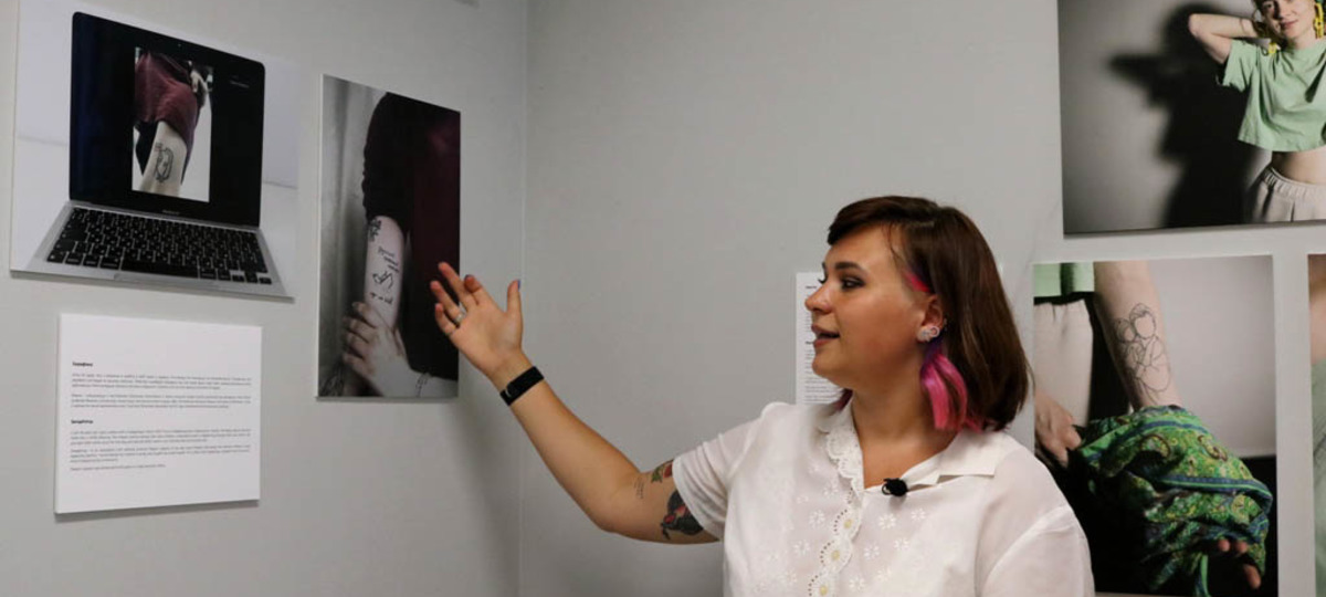 «У одной из героинь выставки набит ежик, который несет бело-красно-белый флаг. Серафима живет в Беларуси и прячет татуировку. Ей тревожно, люди действительно присматриваются. Такое ощущение, что тебя сканируют», — объясняет Евгения.