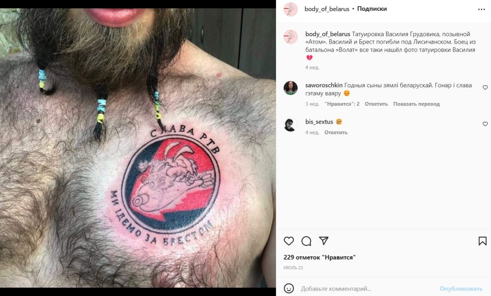«Не было никаких свидетельств, что у Василия Грудовика тоже набит шеврон роты тяжелого вооружения. Бойцы батальона «Волат» заморочились, нашли мастера, который набил ему татуировку, и фотографию. Это единственное свидетельство того, что у «Атома» тоже была такая татуировка. И они мне ее прислали, это очень ценно для меня. У него под шевроном надпись «Ми їдемо за Брестом»», — рассказывает Евгения.